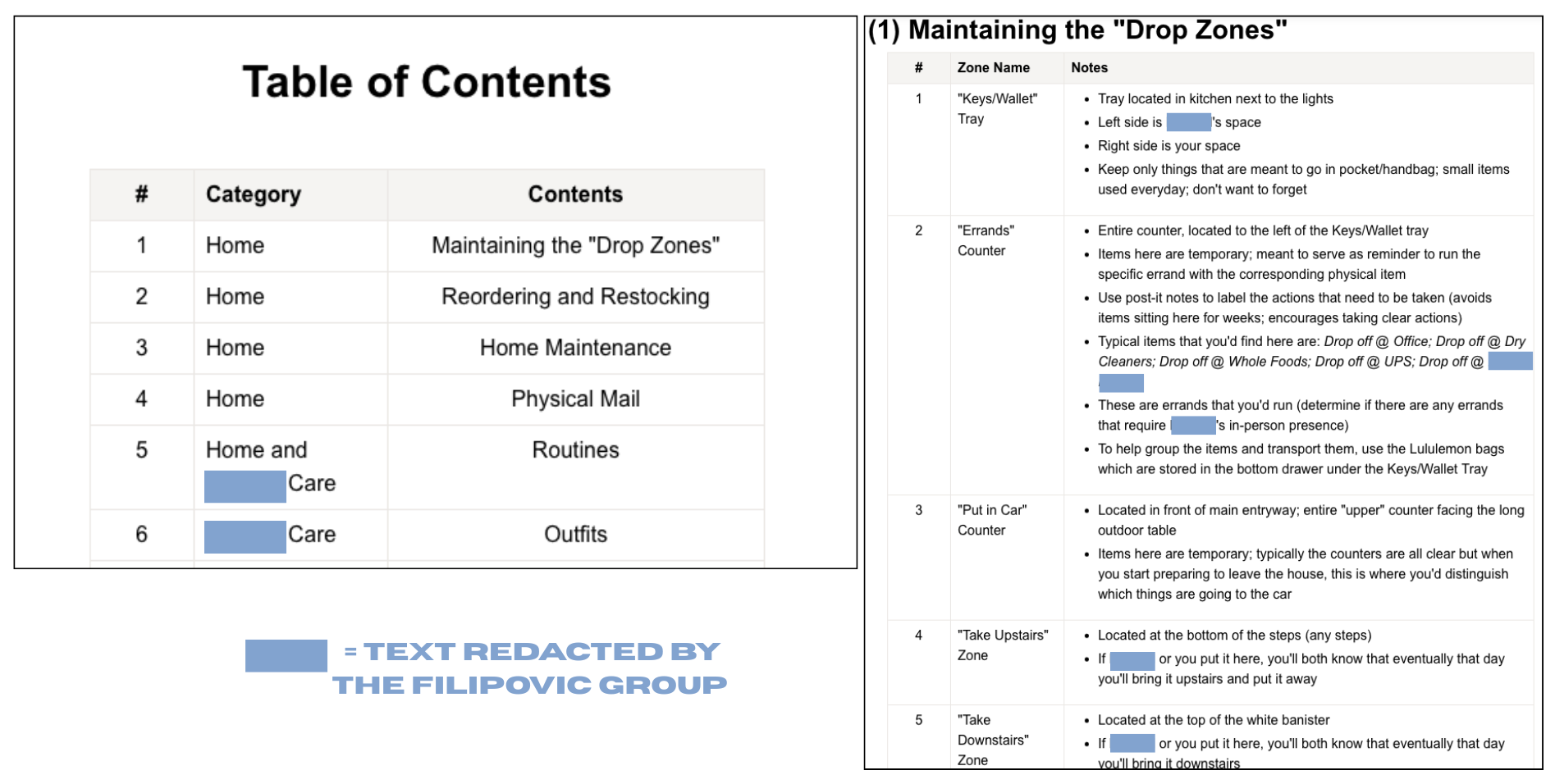 If it’s agreed this document would be beneficial, we’ll create a draft based on existing and new systems. Over the next two weeks to a month, you test out the system to see if pain-points have been adequately addressed. Ultimately, it’s important that this document reflects how you actually live/interact with the space so others who would help you maintain it can be on the same page.